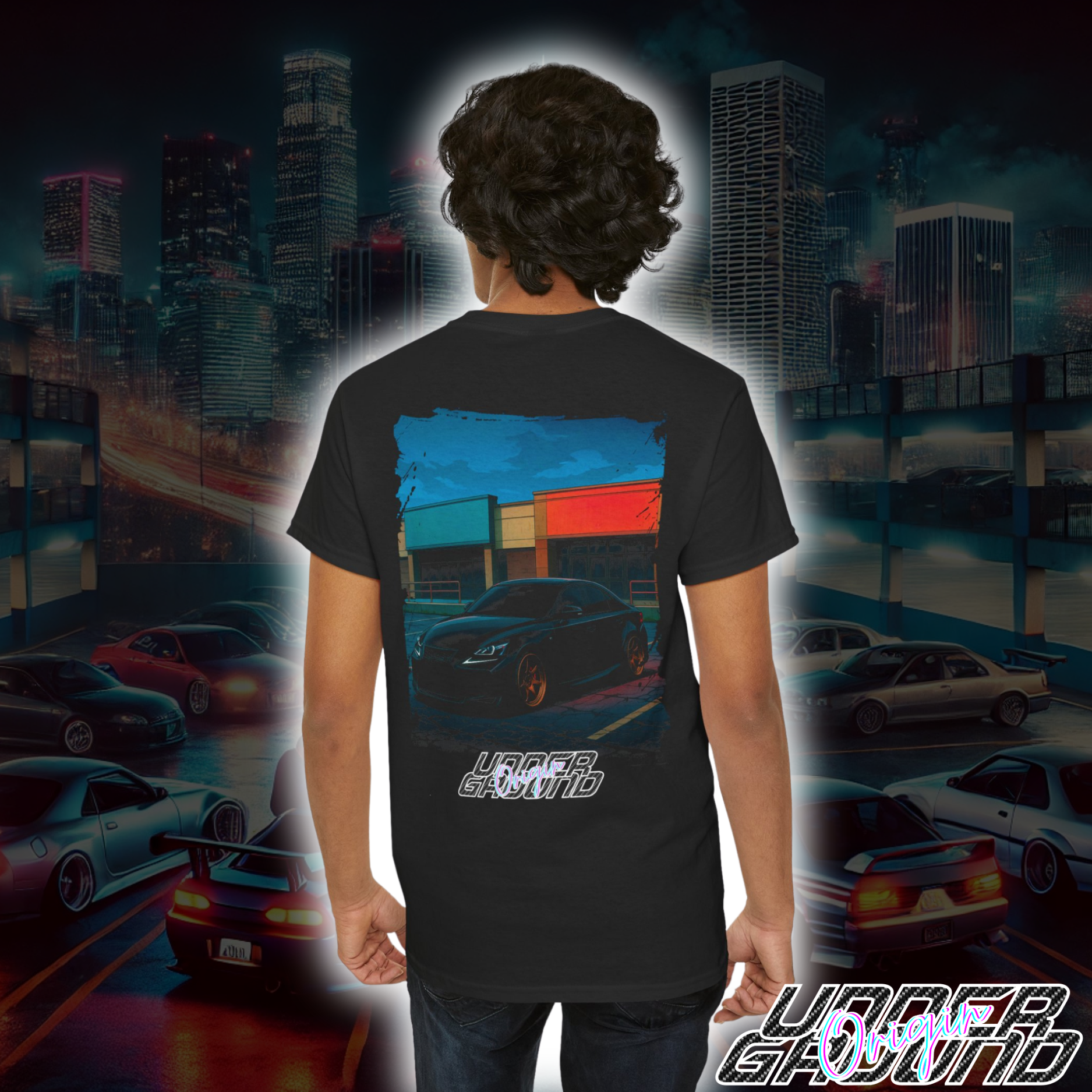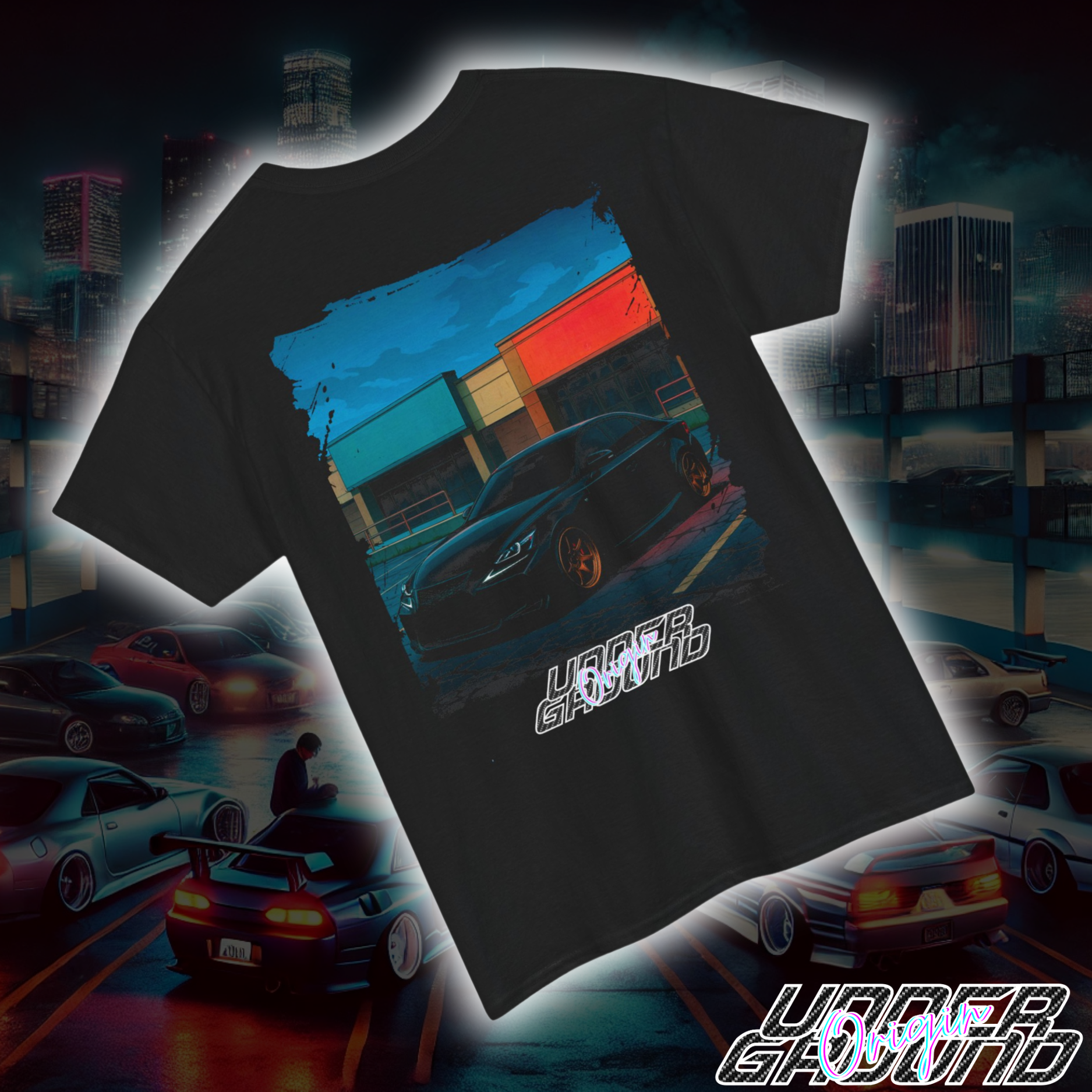 There’s a certain kind of magic that happens when the lights go down and the lots clear out. This tee captures that feeling — the quiet tension of an empty plaza, broken only by the growl of a midnight-built Lexus posted up with full presence.