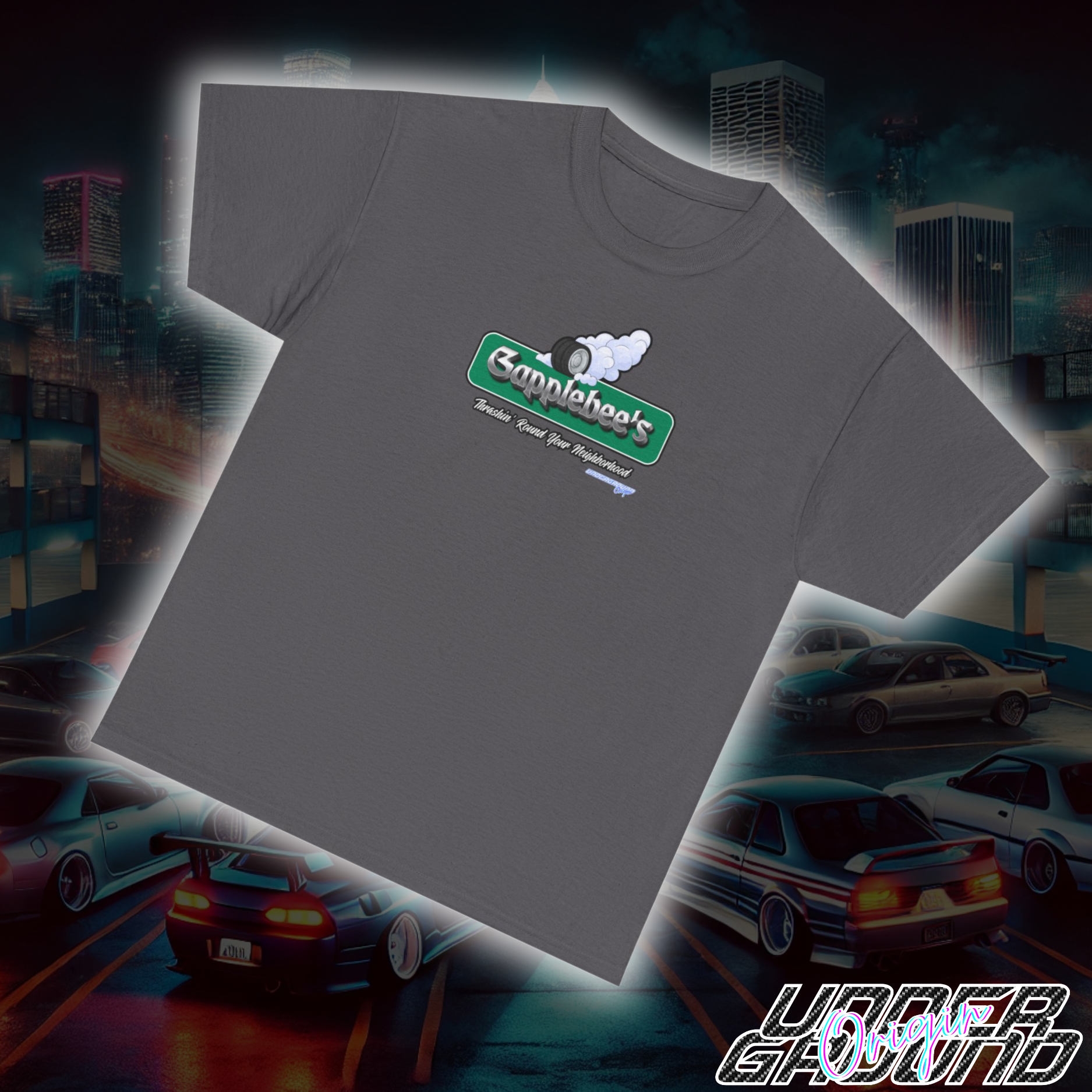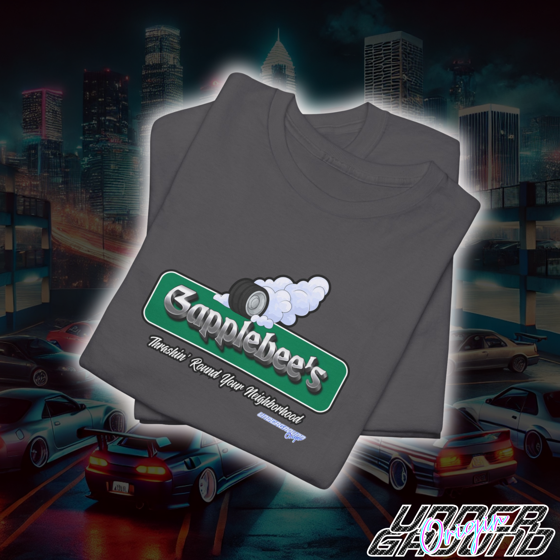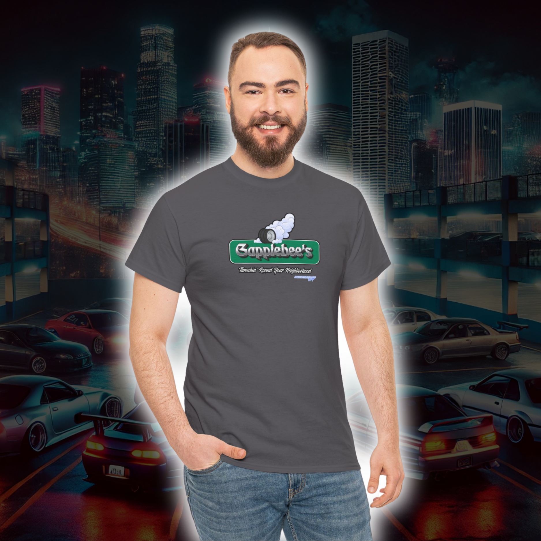 The Gapplebee’s tee flips a classic neighborhood vibe into a full-blown car enthusiast's fantasy. Featuring a cheeky burnout logo with smoke billowing off a slick tire, this design is all about keeping it light, loud, and fast around the block.