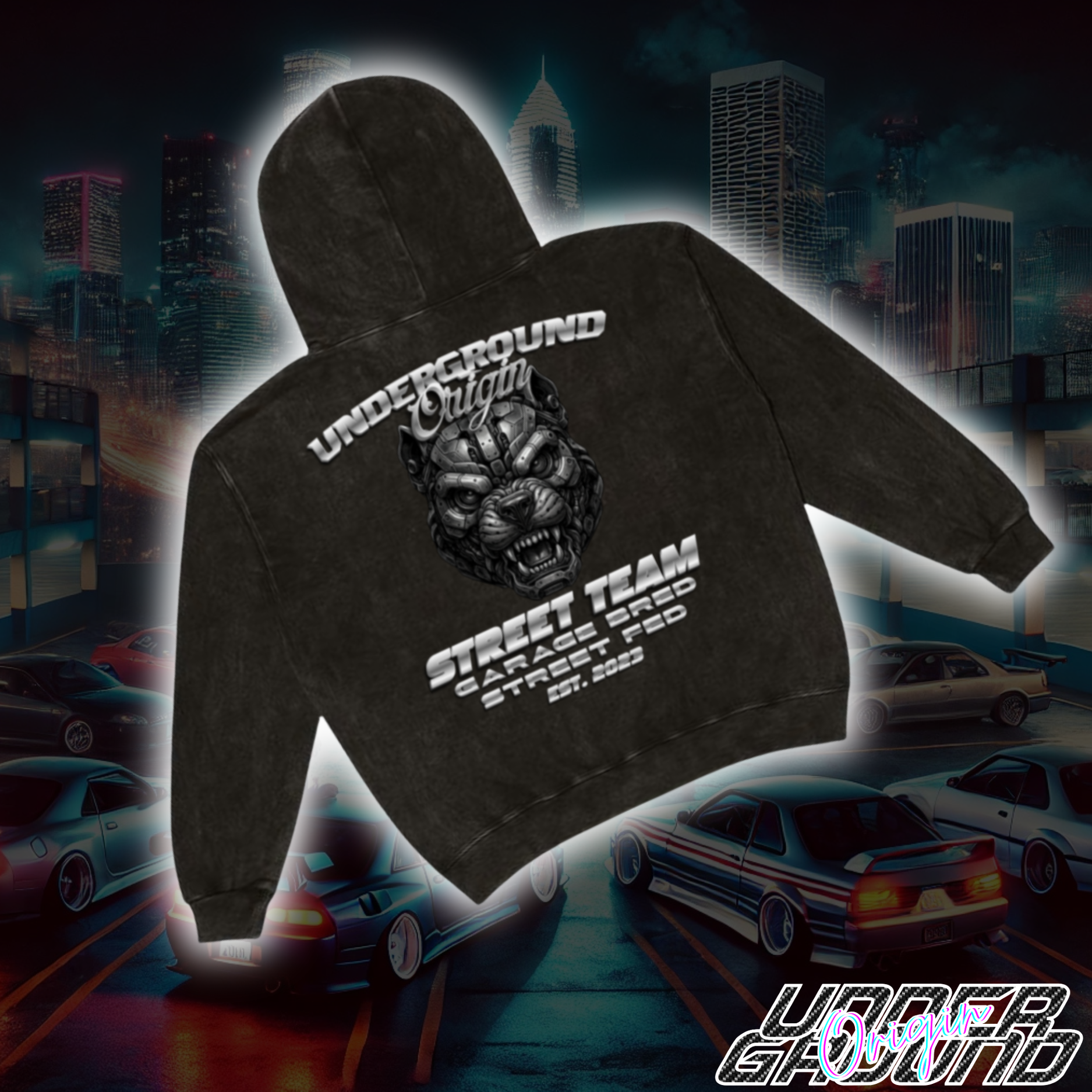Built in the shadows, unleashed on the streets — the Underground Origin Street Team Hoodie is for the crew that lives and breathes horsepower. Featuring a ferocious mechanical beast front and center, this design screams raw power and precision engineering. With bold metallic lettering and an aggressive monochrome finish, it’s a symbol of respect for those who wrench hard, race harder, and never back down. Whether you’re posted up at the meet or carving through the city, this shirt lets everyone know you’re part of the pack.