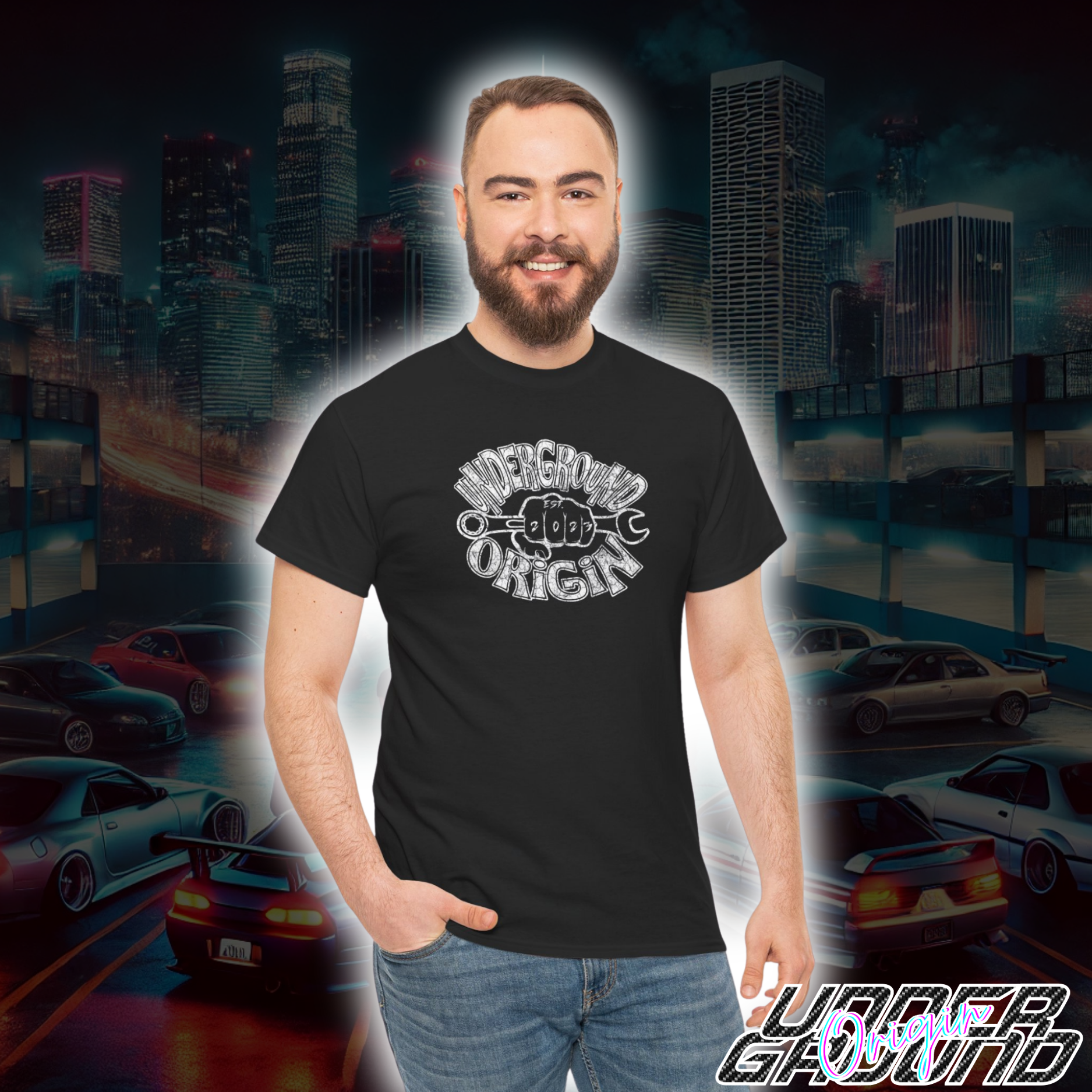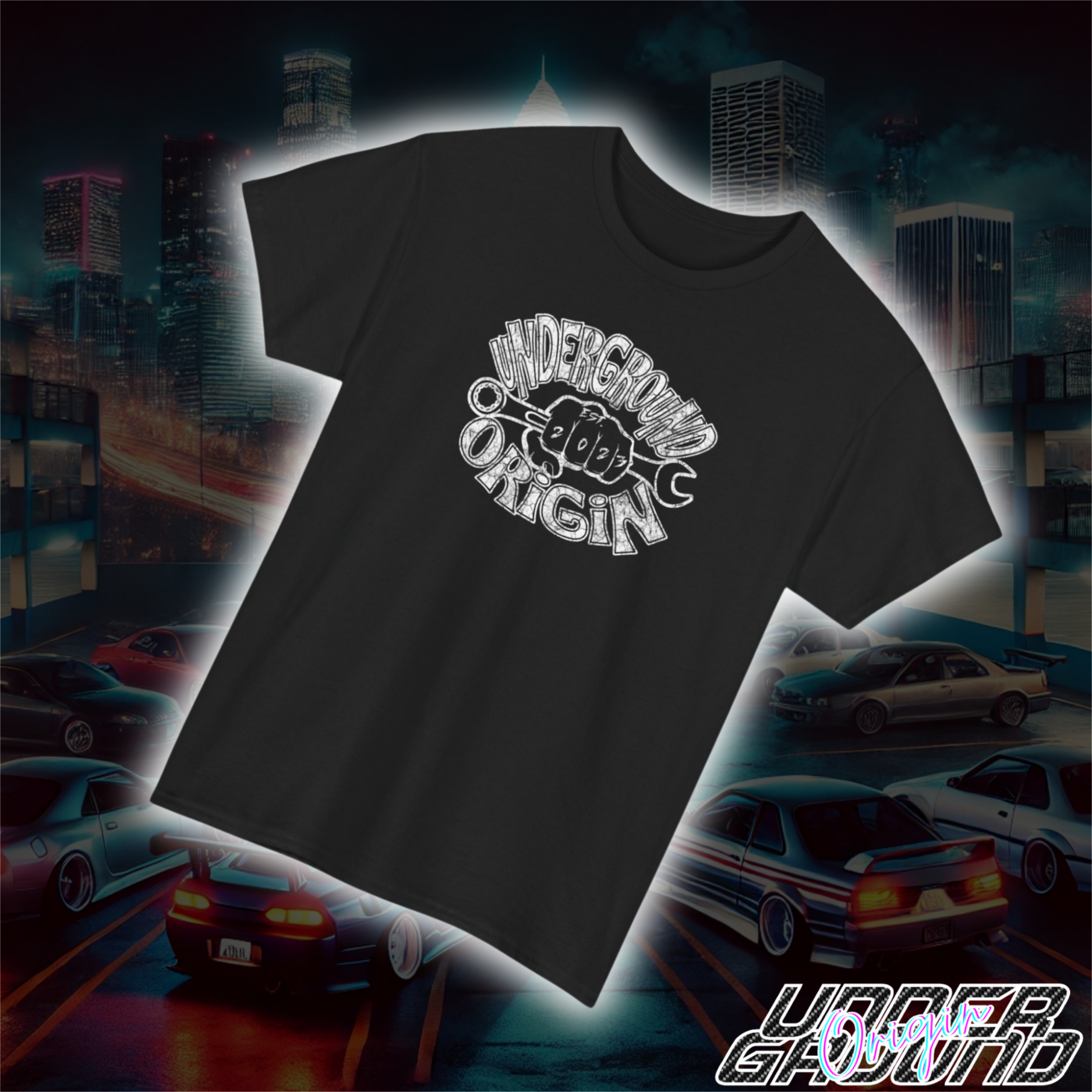 The Wrench & Grind Tee is built for the real hands-on street enthusiast. Featuring a bold Underground Origin logo wrapped around a gritty, weathered wrench-and-fist graphic, this design screams dedication to the garage life and the street scene. The distressed white print on a black canvas captures that raw, grease-under-your-nails energy — perfect for late-night builds, back-alley meets, and track day battles. Wear it as your badge of honor and let everyone know you’re part of the crew that lives to wrench and drives to win.